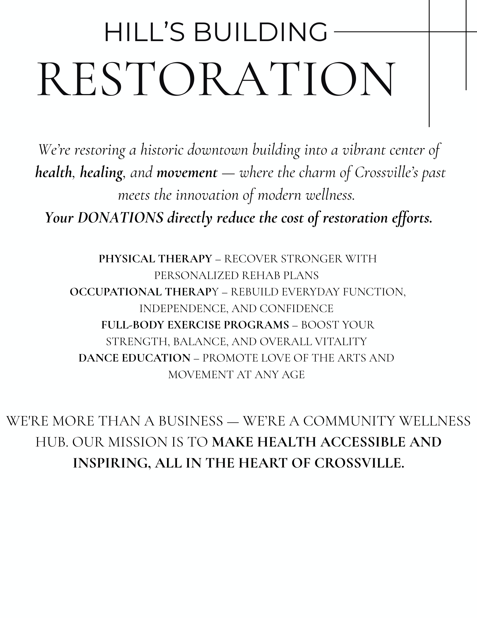 Our mission is to make health accessible and inspiring, all in the heart of Crossville.
